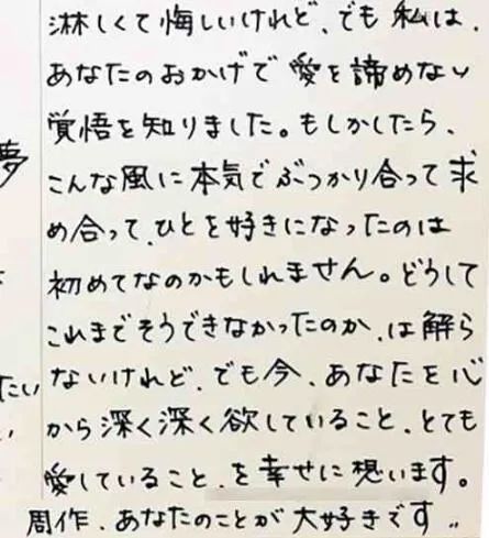 就在网友们对她突然180度的态度转变感到惊讶时,《周刊文春》的新爆料给出了答案:他们公开了两位当事人在出轨期间,互相写给对方的多封手写情书。