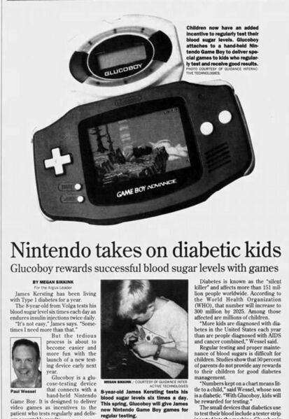 Glucoboy本体是一个血糖仪与游戏卡带结合的产品,由一位名为Paul Wessel的人发明。血糖检测需要扎破手指来采集血液,儿童患者往往不愿配合,该设备的目的便是鼓励糖尿病儿童积极参与日常血糖检测,减少他们对此的恐惧。