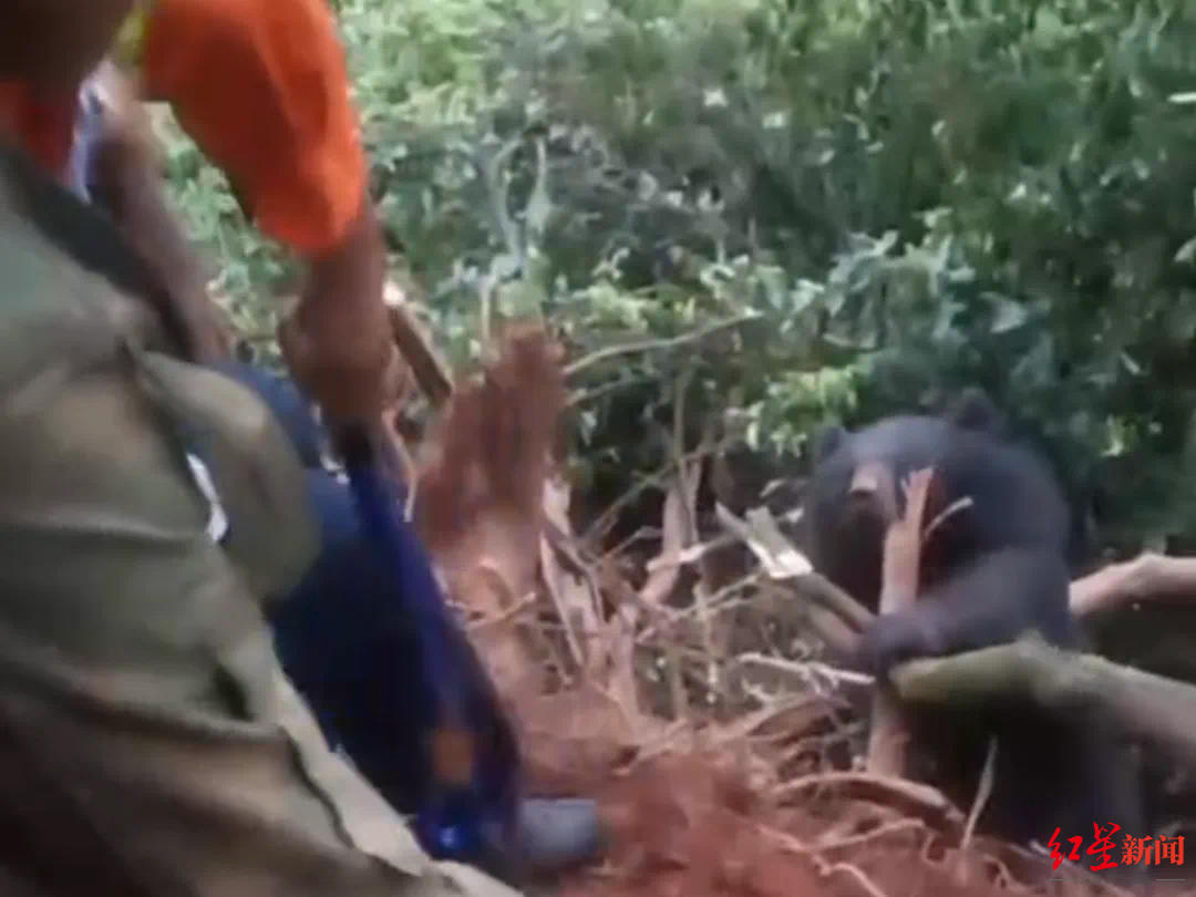 据叙永警方此前通报,近日,叙永公安接到群众报警称,发现一头黑熊被困,请民警前往救助。接到报警后,民警立即赶往现场,发现黑熊被困山林一陡坡边上,该处地形崎岖、陡峭路窄,一根钢丝绳缠住它的熊掌,黑熊被挂在悬崖边无法挣脱。