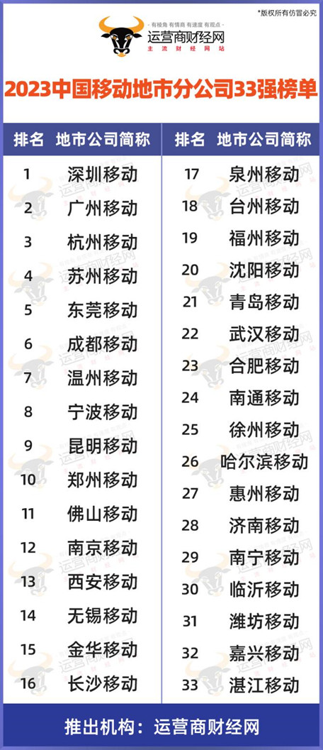 据悉,此次“2023中国移动地市分公司33强榜”排名依据是以一年的营收数据等为硬性指标,仅选取前33名的地市分公司进行排名。而能够入选的均是中国移动旗下规模较大的地市分公司。