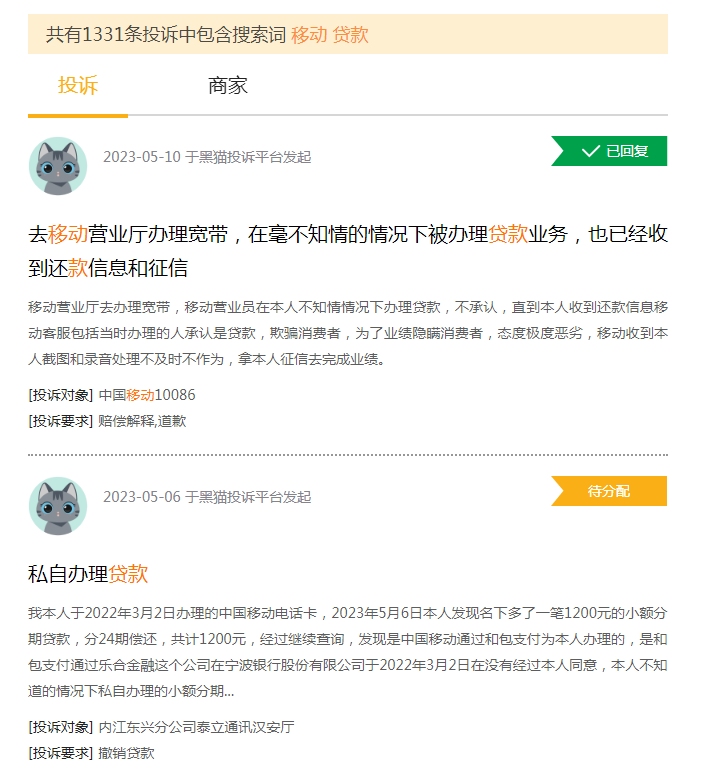 红星资本局梳理发现,全国多地网友都曾遭遇到过类似“送礼变贷款”的难题。红星资本局在黑猫投诉【投诉入口】平台以“移动”“贷款”为关键词进行检索,发现有上千条网友投诉,内容包括在办理手机套餐、家庭宽带等业务的过程中,在业务员的“指引”下,签了贷款协议,办理了网络小额贷款、预授权冻结等金融业务,直到接到催收电话或产生不良征信后,才得知自己被“套路”了。除了中国移动外,中国联通的用户也曾反映过类似问题。