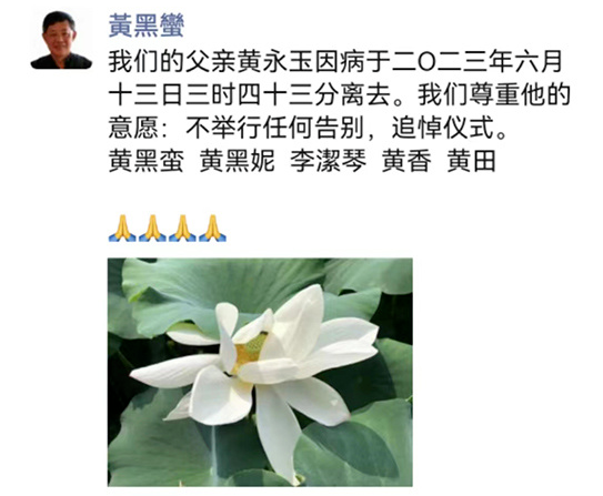 今(14)日下午,著名艺术家黄永玉之子黄黑蛮通过朋友圈发布消息称,父亲黄永玉因病于6月13日去世,依照父亲生前意愿,将不举行任何告别和追悼仪式。
