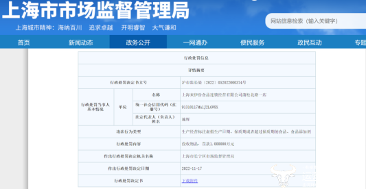 值得关注的是,去年11月底,上海市市场监督管理局网站发布行政处罚决定书(沪市监长处〔2022〕052022000374号)。上海来伊份食品连锁经营有限公司蒲松北路一店存在以下违法行为:生产经营标注虚假生产日期、保质期或者超过保质期的食品、食品添加剂,被上海市长宁区市场监督管理局没收物品,罚款1万元。