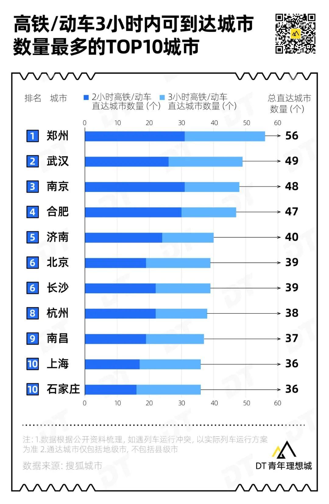 根据搜狐针对国内36个重点城市高铁可通达的重点城市数量、3小时内可通达的地级市数量的分析发现,“九省通衢”的武汉,高铁可直达30个重点城市,数量仅次于北京和郑州。