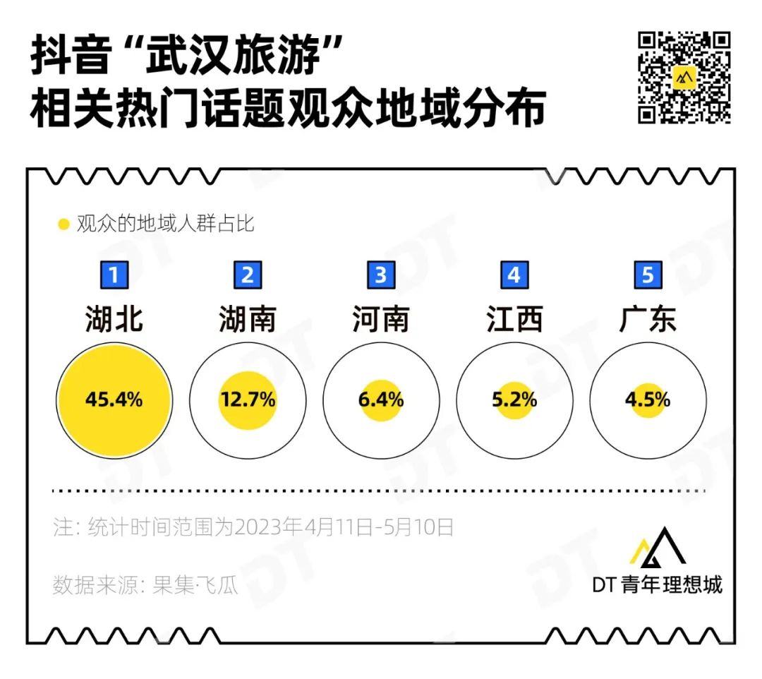 抖音数据同样应证了这一点,抖音“武汉旅游”话题下,相关热门视频互动中,除了湖北本地观众外,湖南、河南、江西观众数量排前三位。