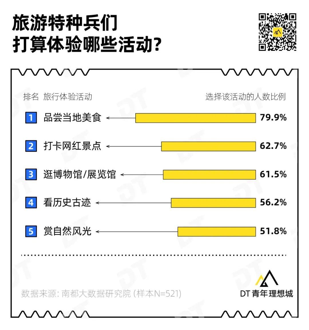 根据南都大数据研究院的网络问卷调查数据,所有旅行体验活动中,最吸引特种兵的是“品尝当地美食”。