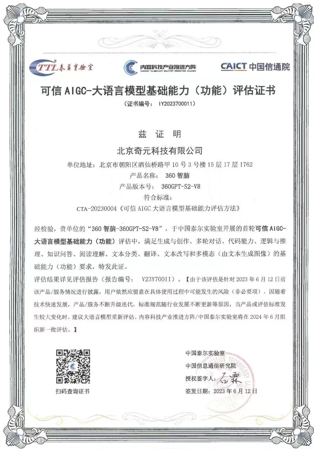 发布会前一天,360智脑刚通过了中国信息通信研究院“可信AIGC大语言模型基础能力”评估,成为首个中国信通院该项评估的大模型产品,在10个部分36项基础能力上均通过评估。