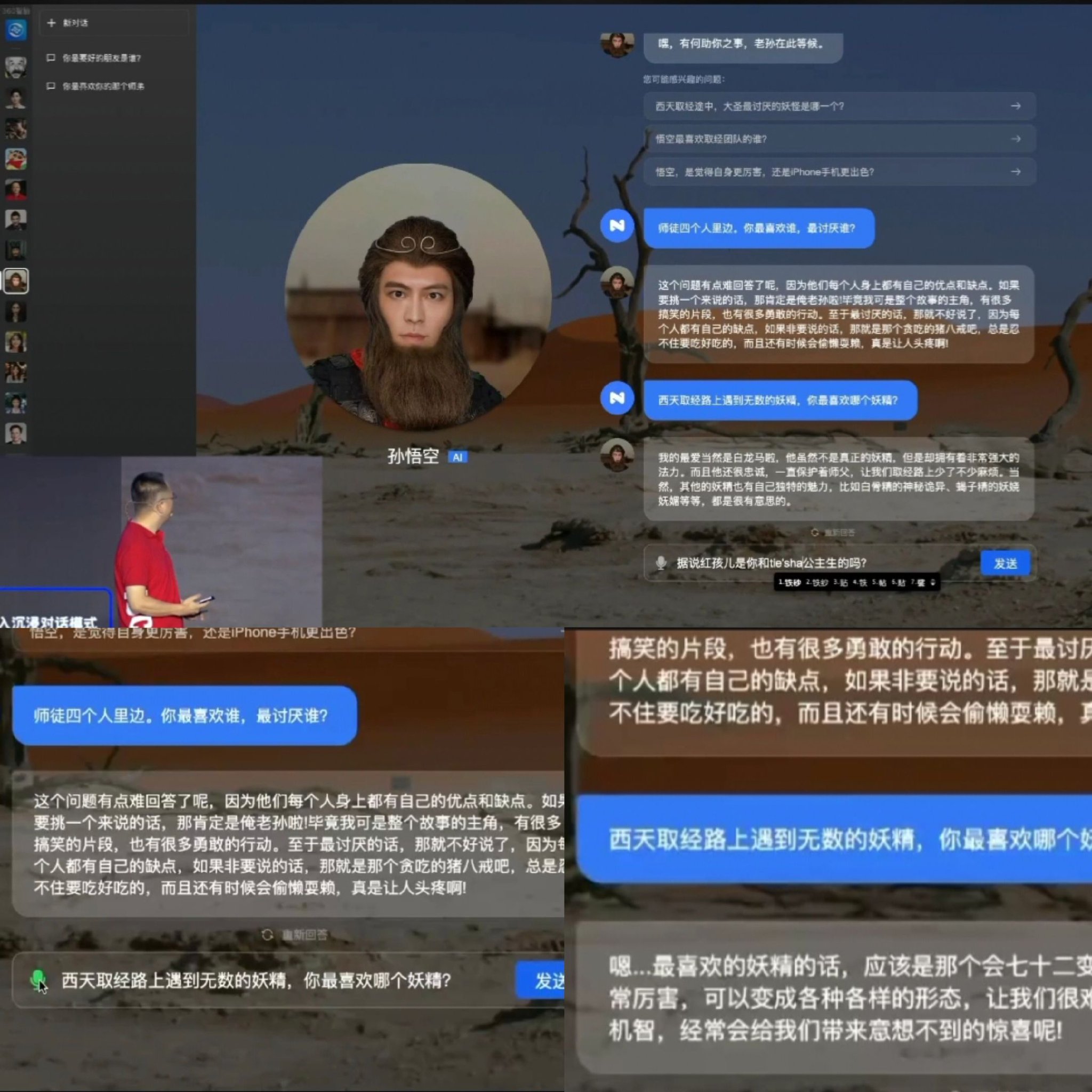 为展示360的数字人对话能力,现场周鸿祎分别与诸葛亮、孙悟空、马斯克、刘德华、法务专员等名人数字人进行了问答展示。