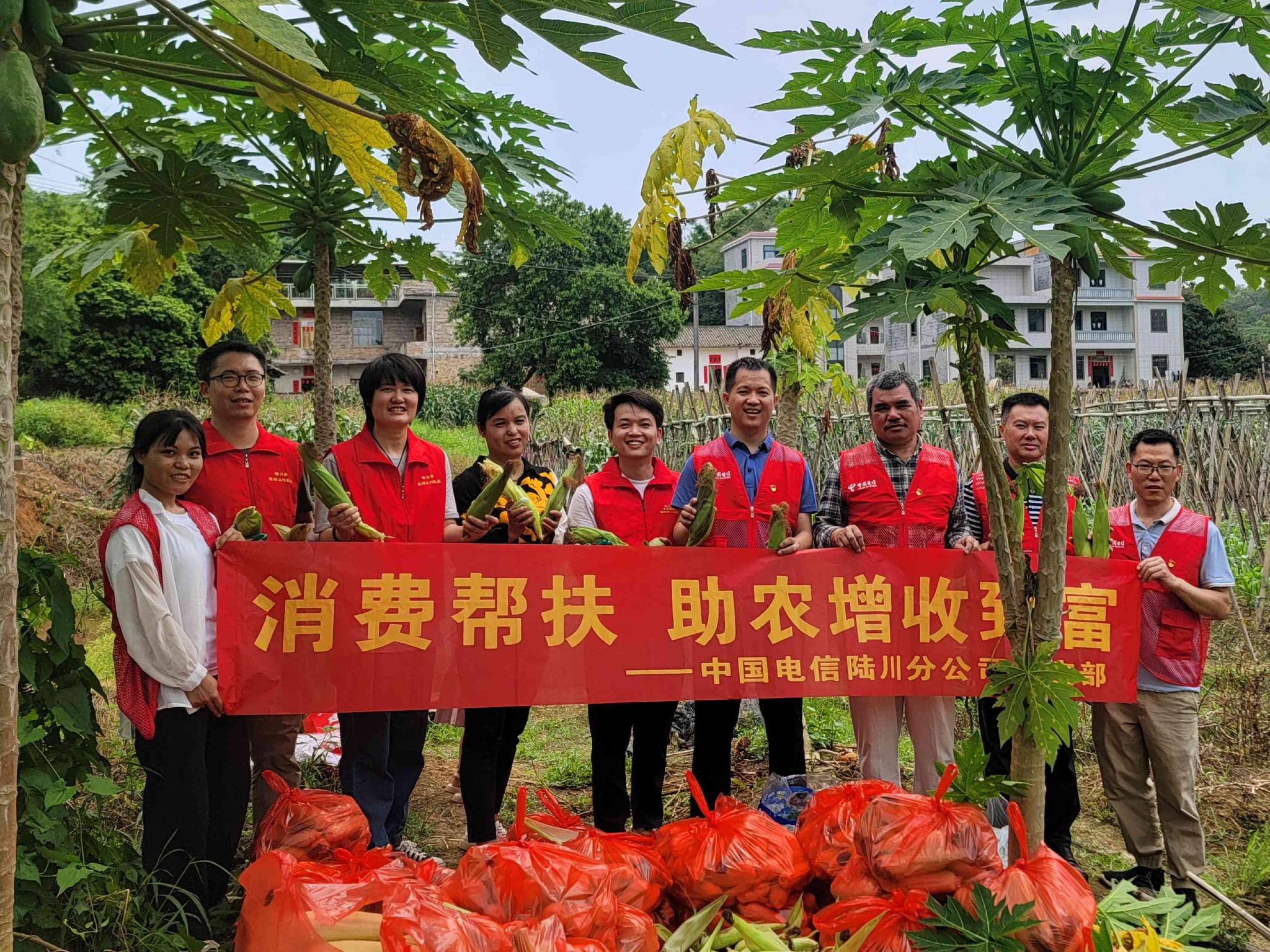 图为中国电信陆川分公司党员志愿者帮助脱贫户搬运玉米。近年来,中国电信陆川分公司结合政策和有关精神,帮助定点帮扶村群众立足当地实际发展种植农业,并积极发动企业员工认购,将消费帮扶与乡村振兴有机结合,促进农民群众持续增收,巩固拓展脱贫攻坚成果,助力乡村振兴。