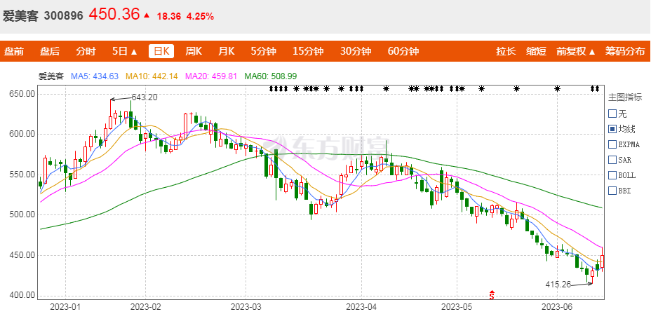二级市场上,医美板块也曾一度回撤。数据显示,爱美客股价于今年1月份出现反弹新高,达643.2元/股,但随后又持续下跌,近日更是持续阴跌。截至目前,较1月股价高点,爱美客股价累计已跌去近30%。