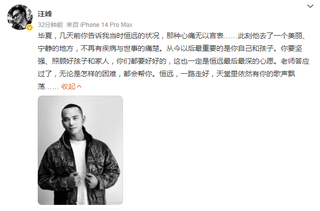 夫妻二人在节目中的导师汪峰,在得知张恒远去世的消息后发文悼念:“恒远,一路走好,天堂里依然有你的歌声飘荡……”