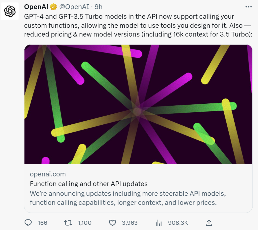 OpenAI 表示:API 中的 GPT-4 和 GPT-3.5 Turbo 模型现在支持调用用户自定义函数,允许模型使用用户为其设计的工具。此外,用户使用模型的价格降低了,OpenAI 也发布了一些新的型号版本(包括 16k 上下文 GPT-3.5 Turbo):