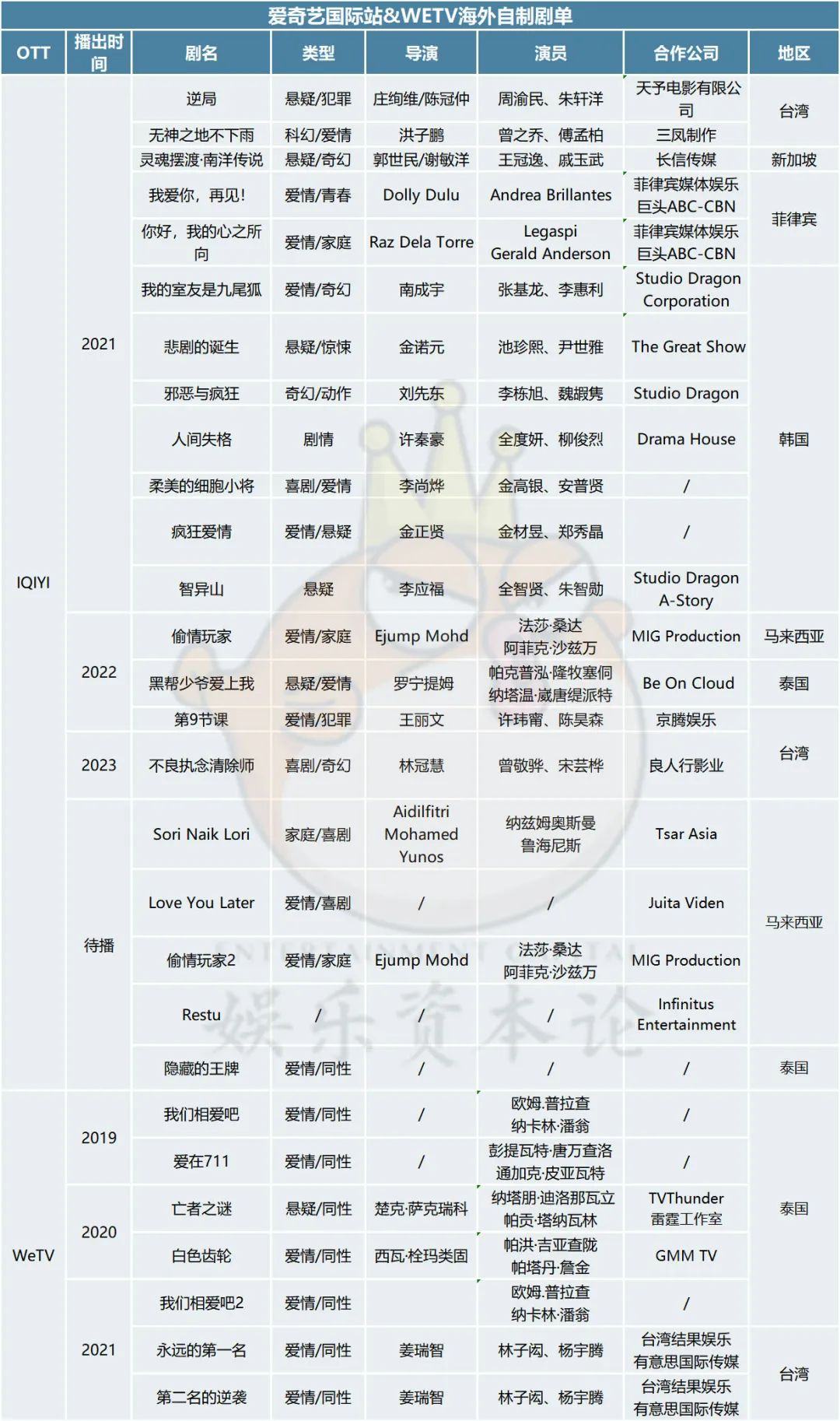 两年前爱奇艺国际站在釜山电影节亚洲内容及电影市场官宣了自制剧片单,其中包括6部韩剧和2部菲律宾剧;今年5月10日的爱奇艺世界大会的海外论坛上,爱奇艺国际站的马来西亚自制剧《偷情玩家2》已位列2023年国际站头部内容,泰国自制综艺《隐藏的王牌》也将开发泰剧版本进行剧综联动。