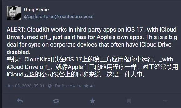 6 月 14 日消息,苹果宣布自 iOS / iPadOS 17 和 macOS Sonoma 开始,用户关闭 iCloud Drive 之后,使用苹果 iCloud 数据库的第三方应用不再受影响,可以继续同步数据。