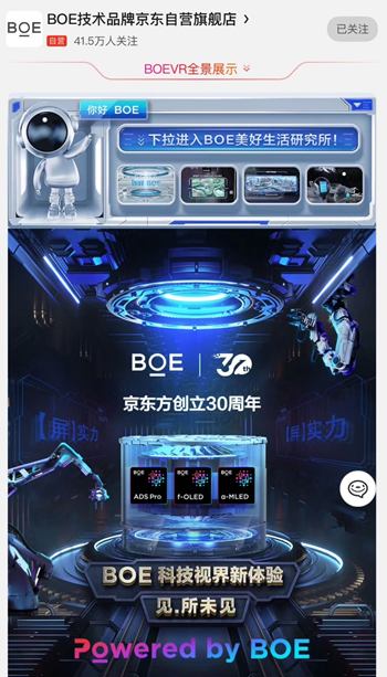 具体来看,在深化用户体验层面,BOE技术品牌旗舰店入驻京东以来,双方携手打造的线上沉浸式技术体验馆,以极具科技感的3D、VR场景化展示形式全面升级用户体验,共同推动了BOE三大技术品牌ADS Pro、f-OLED、α-MLED在终端品牌及消费者中的认知,累计上线11大品牌的合作产品、联合策划3场专项活动、吸引近40万粉丝关注店铺。BOE技术品牌旗舰店作为BOE“技术+品牌”双价值驱动模式的形象展示窗口,极大提升了消费者辨识和认知前沿技术的能力,缩短了技术产品走向市场的产业路径,以直接、高效的商业模式赋能合作品牌,为产业链合作伙伴打造出了全方位的资源赋能和全新的联合“破圈”品牌营销阵地。
