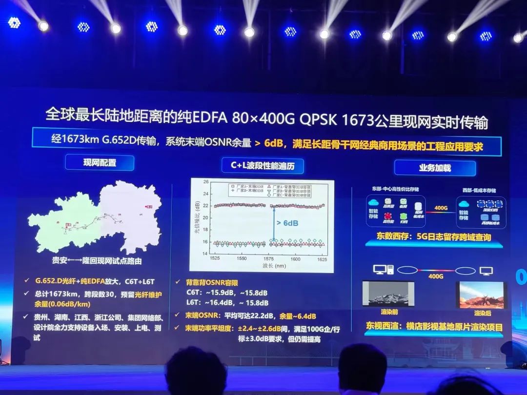 C114讯 6月14日消息(九九)日前,中国移动在贵州省贵阳市举办“九州”算力光网发布会。会上,中国移动公布400G QPSK极限传输技术实验最新进展情况:实现全球最长陆地距离(1673公里)纯EDFA 80x400G QPSK现网实时传输。基于G.652.D光纤+纯EDFA放大,预留光纤维护余量(0.06dB/km),系统末端OSNR余量>6dB,验证了400G QPSK满足长距骨干网经典商用场景的工程应用要求。