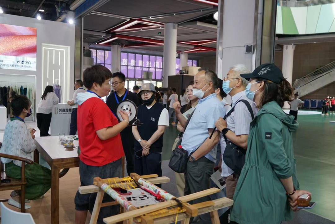 “四川丝绸”展馆内,展品门类丰富,特色优势突出。非遗产品蜀锦、蜀绣、丝毯以及手绘工艺品等产品以其精妙的技艺和极强的艺术美感吸引了不少观众;精品蚕茧、高品位生丝、真丝家纺、优质蚕丝被、高档绸缎受到不少客商关注,对接洽谈、签约订单的客商络绎不绝;四川特色蚕桑资源综合开发创新产品备受消费者青睐,桑叶茶、桑葚汁、桑葚酒、冬桑凉茶、桑果干等成为展馆内人气产品。许多展品在展会首日被抢购一空,备受杭州市民和采购者喜爱。此外,四川展团还通过“中国丝绸”抖音直播间的四川丝绸专场,对参展企业和产品进行宣介和直播带货,为场外观众提供云上观展、交流互动、畅快购物的便捷高效服务。