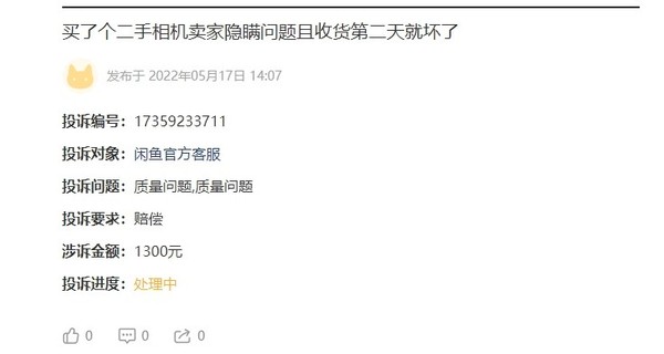 CNMO注意到,在黑猫平台上,与此相似的事件有很多。有消费者表示,自己在闲鱼买了一个尼康二手相机,收货当天发现版本不对,是个水货,但开机功能正常,第二天再次打开时发现无法对焦,关机后镜头无法收回。随后该消费者与卖家沟通,但是无果,还被拉黑。之后跟闲鱼平台反应,客服表示,已经确认收货,钱是要不回来了。消费者说道:平台赔了我闲鱼体验基金200元,但是修这个根本不止200元,而且这个东西根本用不了。