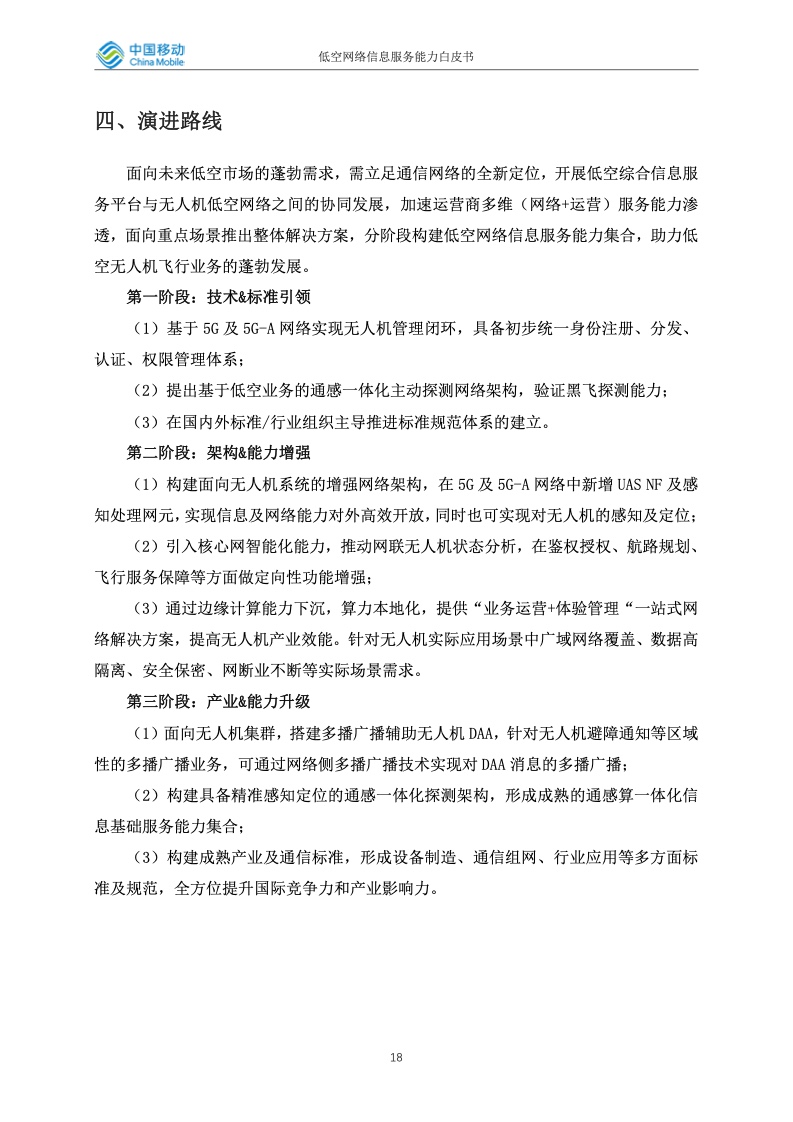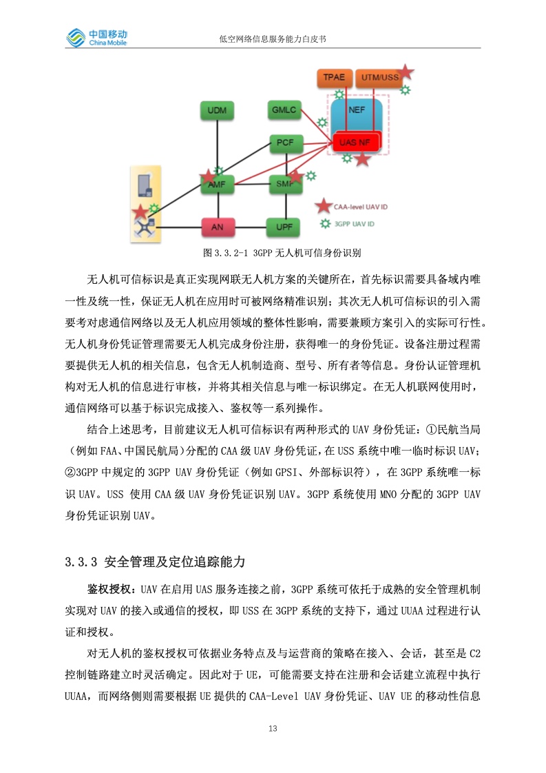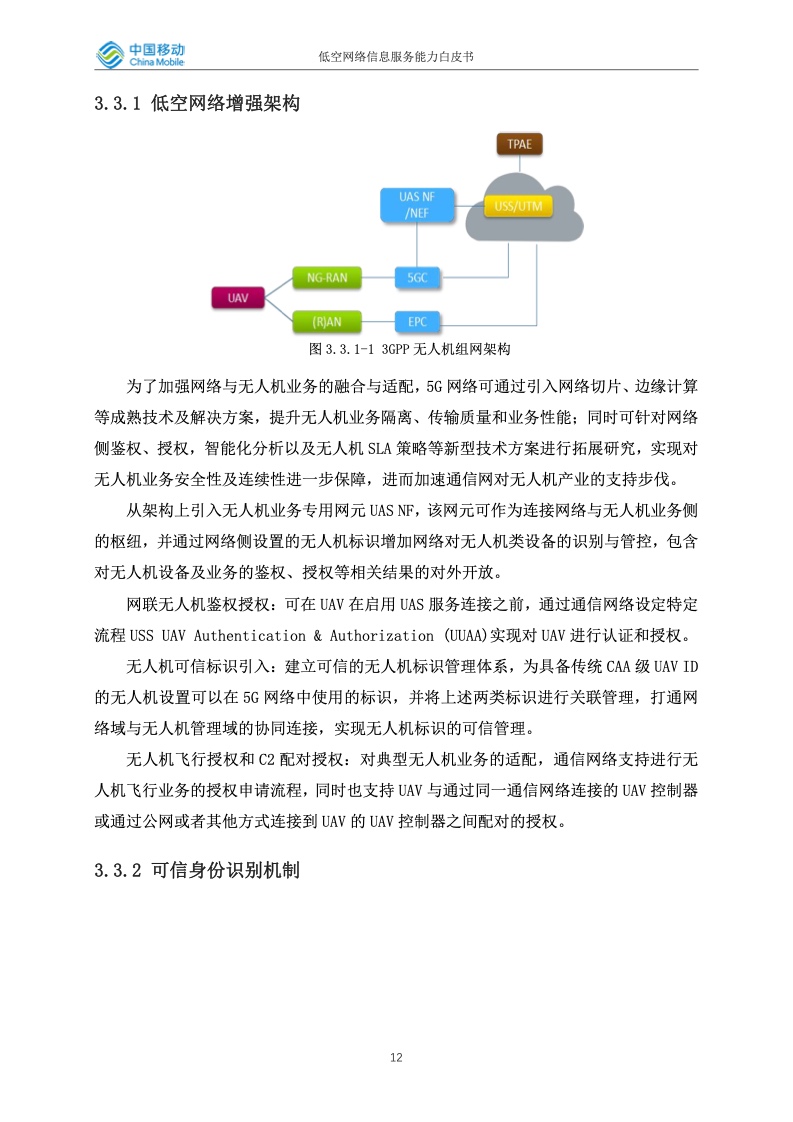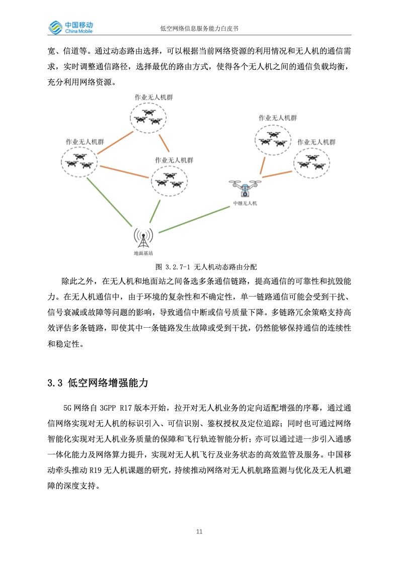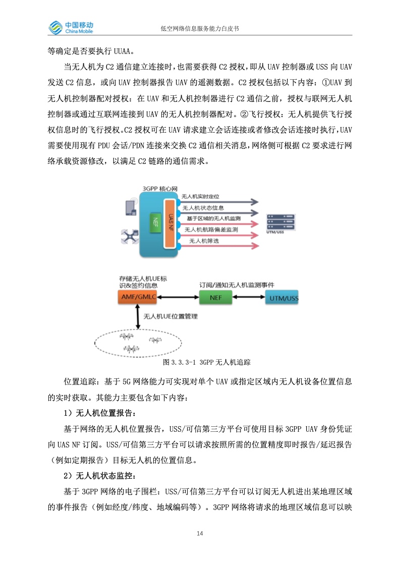 3GPP自 R17版本开始,开展5G网络对无人机业务的持续定向适配和能力增强,中国移动研究院牵头了R19 SA1无人机业务需求研究及规范制定,推动5G网络对无人机航路监测与优化、无人机避障的深度支持。中国移动致力于打造面向无人机应用的全场景全能力低空网络,既面向无人机提供高稳定性、高质量网络服务,保证无人机可以全域飞、安全飞、智能飞;又面向监管需求方要求,实现对无人驾驶航空器的有效管理,使得监管方能在任何时间任何地点与任何无人机保持低时延的双向通信,以保证监管方对无人机能看得见、叫得到、管得住。