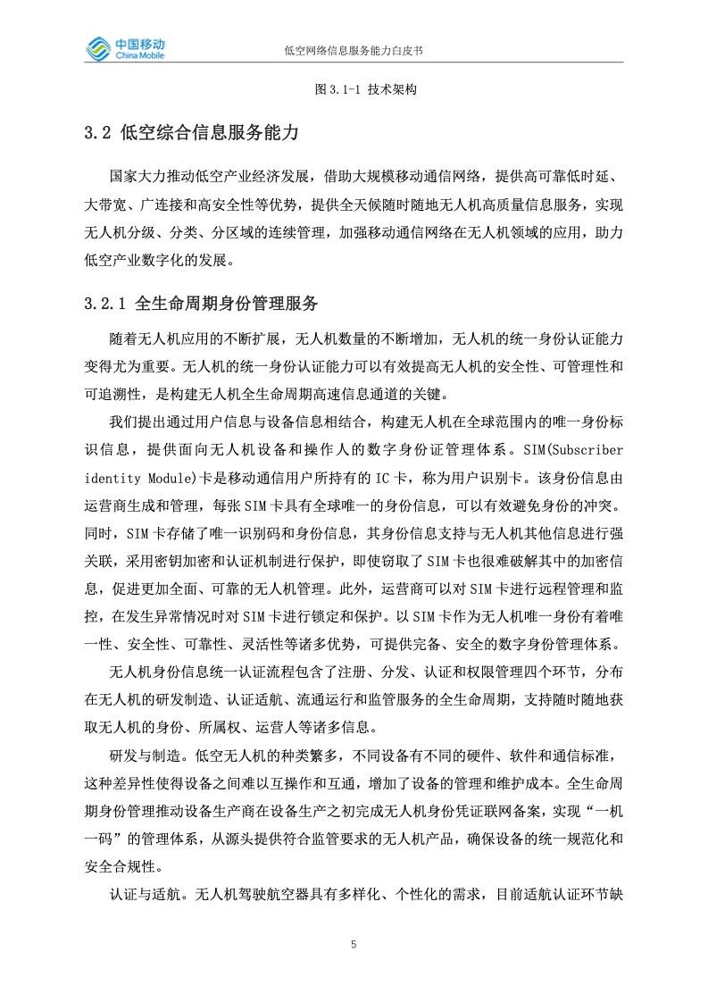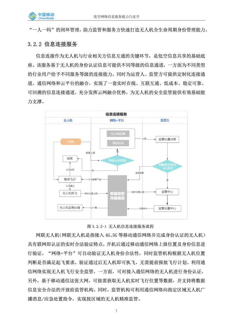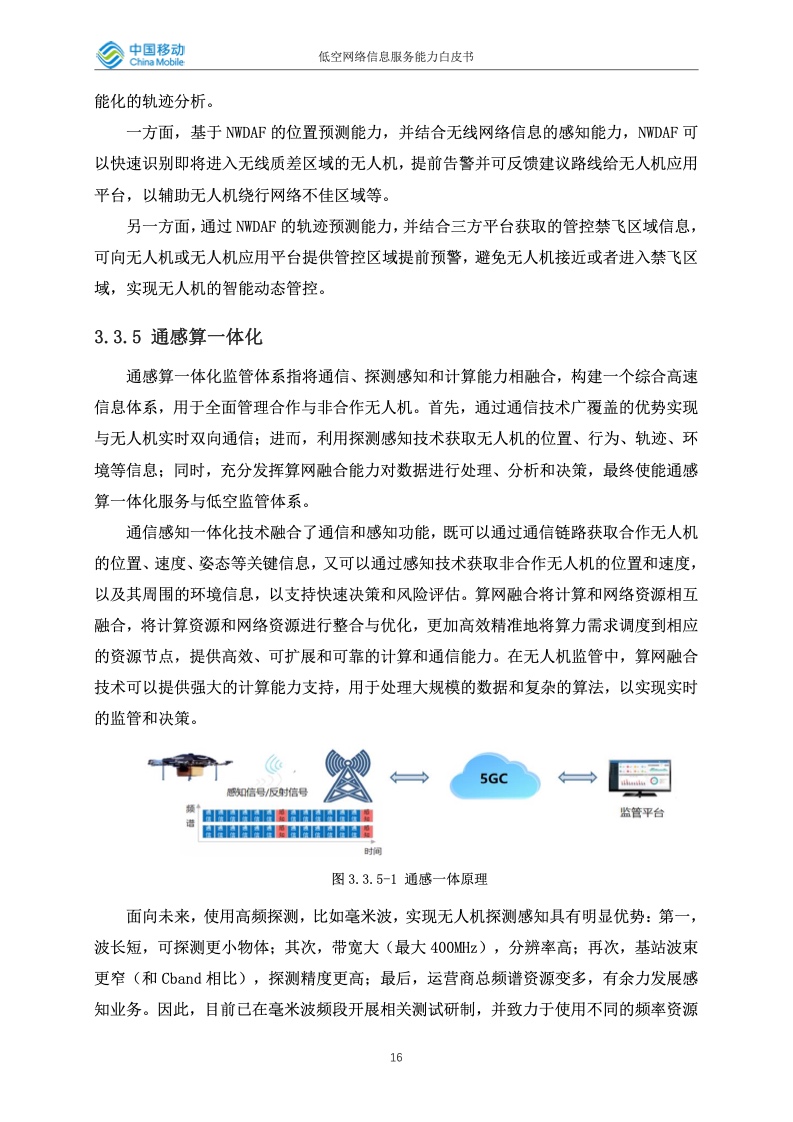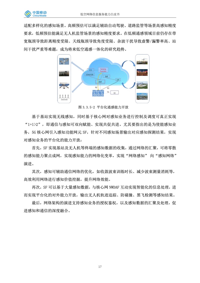 本次发布的白皮书系统阐述了无人机低空网络架构演进方向及增强能力,提出了可信身份识别、鉴权授权、定位追踪、智能化分析、无人机感知五项关键方案及能力。白皮书的发布将加速5G网络融入无人机应用,不仅实现网联无人机接入的安全可控、实时监测;同时也可依托网络智能化实现对无人机业务质量的保障和飞行轨迹智能分析;进一步地,可通过引入通感一体化技术和网络算力,实现对无人机飞行状态的高效监管、业务状态的稳定保障,加速无人机运营方式的变革与升级。