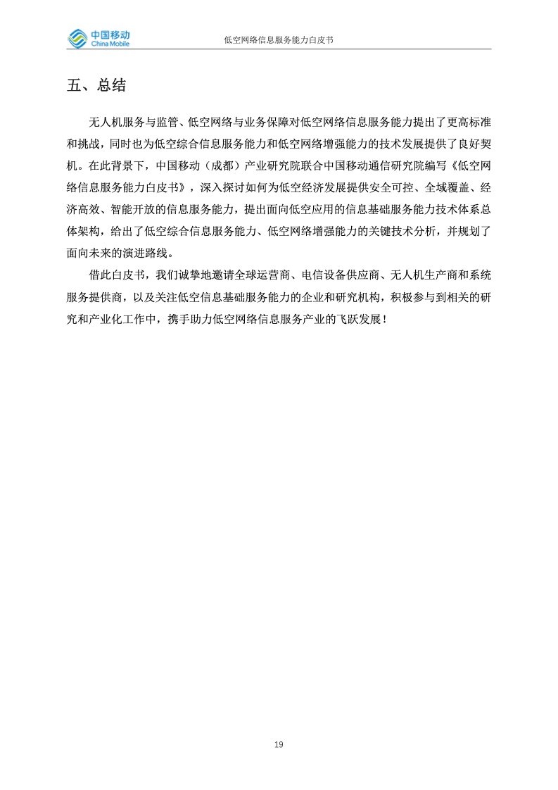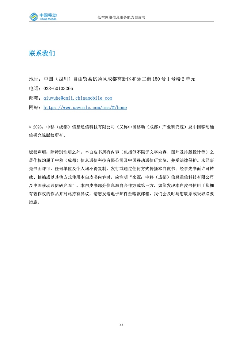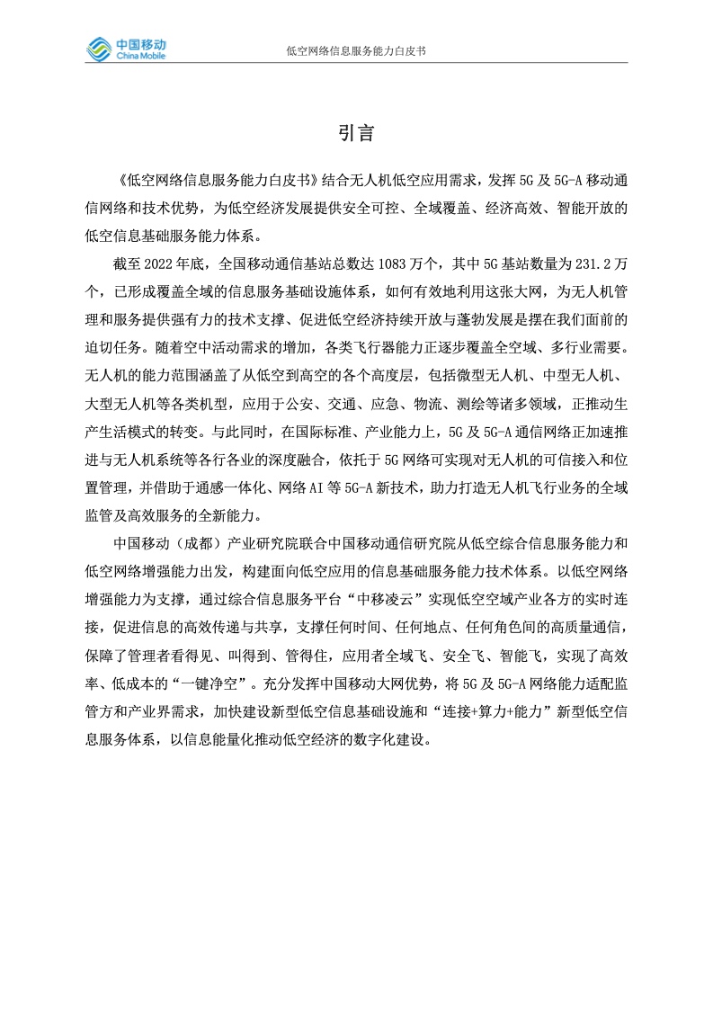 未来,面向低空市场的蓬勃需求,中国移动研究院将立足通信网络的全新定位,持续发挥标准引领作用,面向重点场景推出解决方案,分阶段构建低空网络信息服务能力集合,加速低空无人机业务的发展;同时,联合中国移动(成都)产业研究院,构建“网络+平台”的多维综合服务能力,拓宽电信运营商在无人机市场中的纵深与边界,与无人机生产商、系统服务提供商、通信设备供应商,以及关注低空网络信息服务的研究机构共同携手,积极参与到产业化工作中,助力低空无人机应用的飞跃发展。