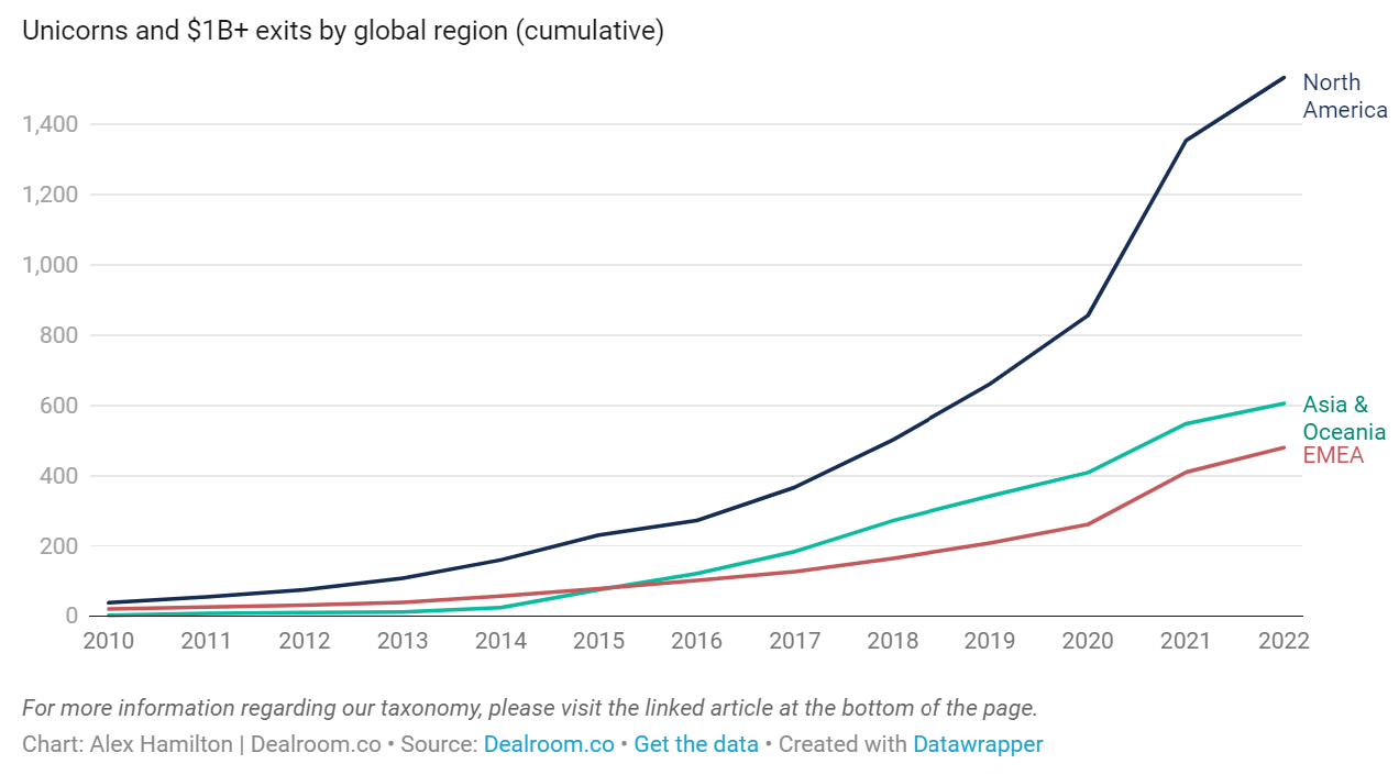 尽管三大区域在 2022 年都出现了下降,但北美新独角兽数量下降幅度最大,下降64%。