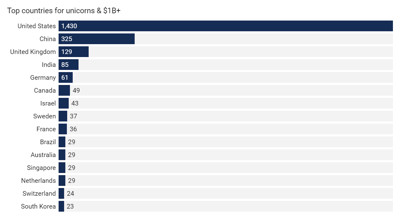 不出所料,根据初创公司总部的数据,美国拥有的独角兽数量(超过 1400 家)超过任何其他国家。 中国以 325 家独角兽和 10 亿美元以上的投资退出位居第二,其次是英国、印度和德国。