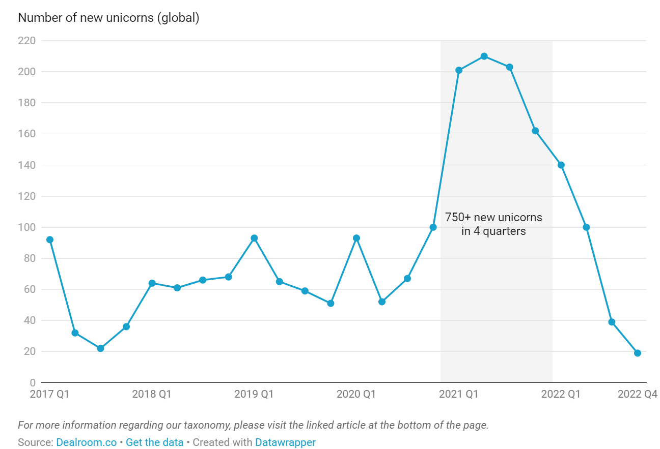 自 2018 年以来,每年大约有 250-300家新的独角兽诞生。2021 年除外,当时这个数字飙升至 787家,相当于平均每天有两个以上的独角兽。 2022年,新独角兽创投崩盘,较2021年峰值大跌60%,后两个季度为逾五年来最平静。
