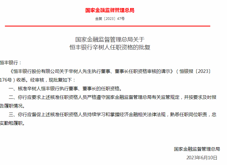 国家金融监督管理总局官网6月12日发布的批复显示,核准恒丰银行执行董事、董事长辛树人的任职资格,成为恒丰银行改革重组后的第二任董事长。