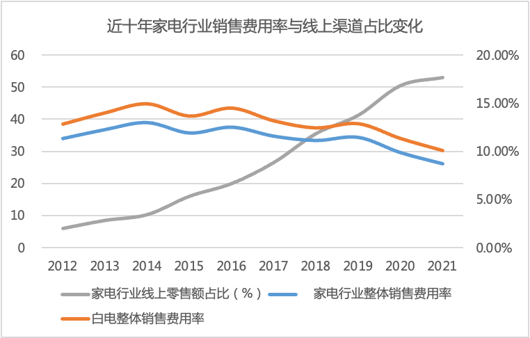 如上图所示,渠道层级的削减对家电行业带来的更高的运营效率。《2021中国家电市场报告》显示,2021年我国家电线上市场规模占整体市场的52.9%。有资深行业媒体人士指出,线下渠道主导的时代,家电渠道费用率在15%以上,导致家电企业利润薄如纸。2021年,虽然原材料和人工成本上升,但主要品牌毛利率都稳定在20%左右。