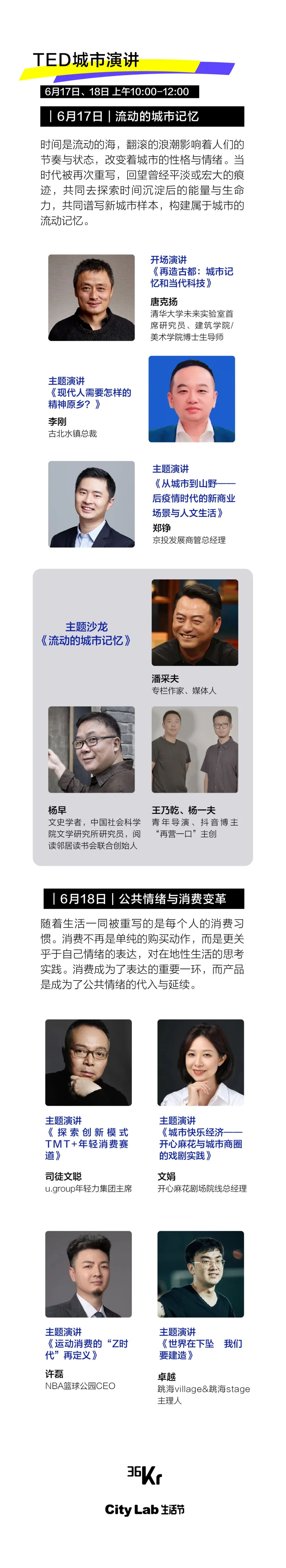 6月17日及18日上午10点至12点,在36氪CityLab生活节现场,从事商业、建筑、文旅、文化影视等行业的企业家、学者、导演,将登上TED城市演讲单元的主舞台,现场将会举行两场演讲&沙龙活动,分别以流动的城市记忆、公共情绪与消费变革为主题。