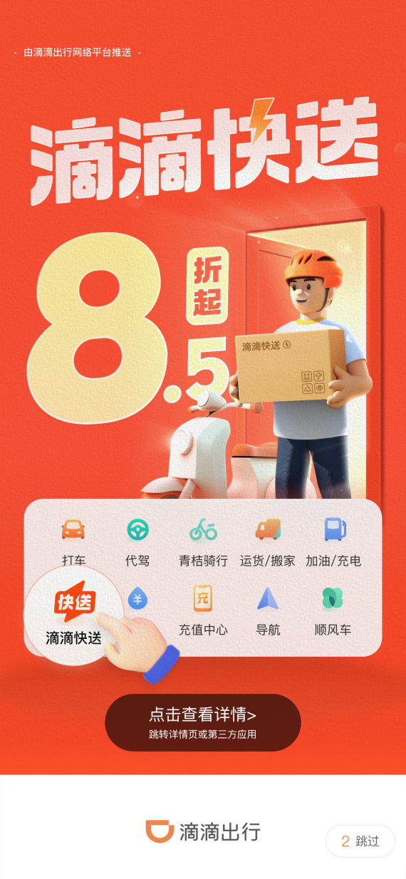 6月13日,滴滴出行平台新增滴滴快送业务,目前已接入达达快送、闪送、UU跑腿三家公司,提供“经济帮送”“专人直送”的小规格物品的即时配送服务。目前已在成都、杭州、北京等全国200多个城市开通服务。
