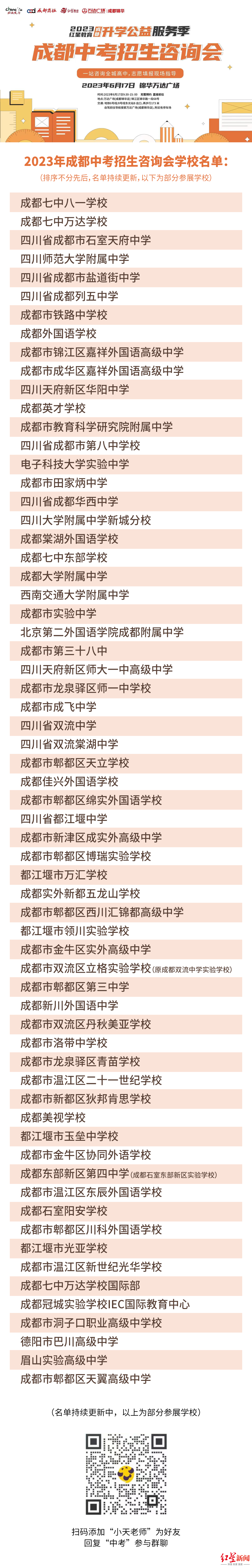 此外,中考结束后,对于考生和家长而言,最重要的莫过于学校考察和志愿填报。为了让广大中考考生和家长在考完后少跑路,一站咨询全城高中,为志愿填报充分打好提前量,6月17日(本周六),成都发布、成都商报、红星新闻、红星教育“我为群众办实事”成都升学公益服务季,将在锦华万达广场(锦江区锦华路一段68号),举办成都中考招生咨询会。届时,近百所主流公、民办高中学校相关负责人,将来到咨询会现场为各位考生和家长,进行面对面答疑解惑,为考生的中考志愿填报进行专业、权威指导。