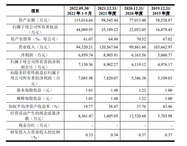 2019-2021年以及2022年1-9月(下称“报告期”),公司实现营业收入分别为10.37亿元、9.99亿元、12.06亿元、9.43亿元,净利润分别为5060.77万元、6165.56万元、8905.91万元、6959.74万元,公司业绩稳定增长。