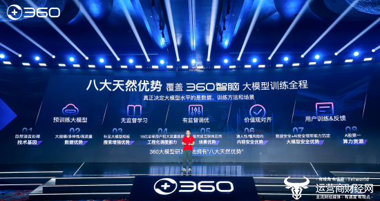6月13日,360集团举办360智脑大模型应用发布会。360集团创始人周鸿祎介绍,360大模型研发落地拥有“八大天然优势”,完整覆盖训练全程。同时,360智脑的生成与创作、多轮对话、代码能力、阅读理解、逻辑与推理、多模态等十大核心能力可覆盖大模型全部应用场景。自2023年3月29日以来,360智脑从1.0迭代至4.0版本,应用成果持续落地,刷新大模型“中国速度”。