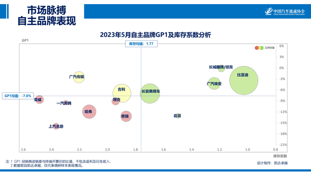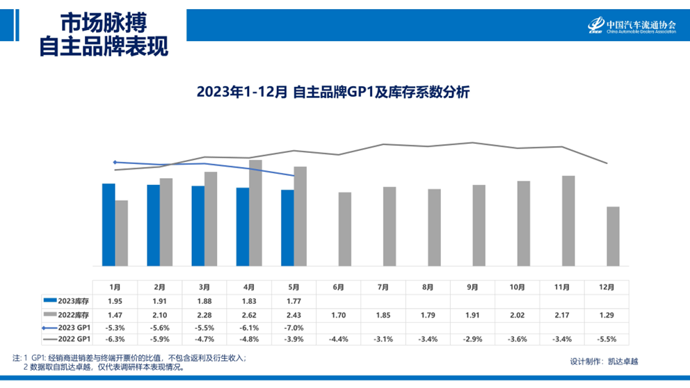 2023年5月,自主品牌库存系数为1.77,较上月小幅下降;GP1为-7.0%,与上月相比小幅下降。自主品牌今年来表现持续稳定,自主品牌的综合产品力越来越强,被更多中国消费者所认可。但自主燃油品牌新车库存依然高企,希望燃油车厂家关注经销商库存深度及资金健康。