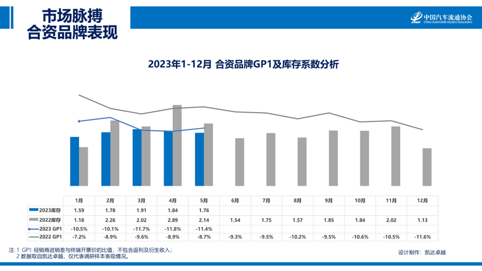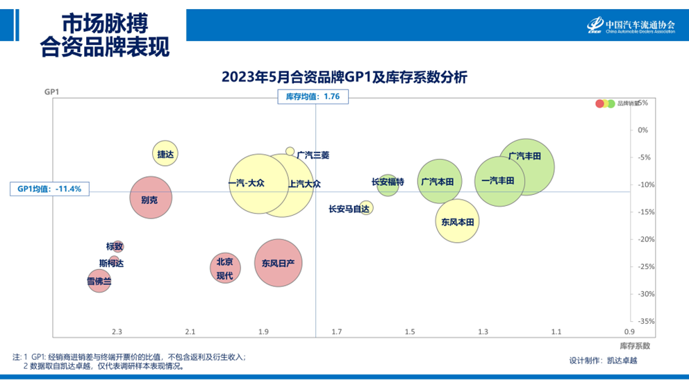 2023年5月,合资品牌库存系数为1.76,相比4月份小幅降低,GP1微升至-11.4%。合资品牌细分市场自2021年开始逐渐呈现竞争压力大、市场表现下滑之势;目前合资品牌GP1已经下降至相对较低的位置,经销商考虑到盈利压力很难再有下降空间。