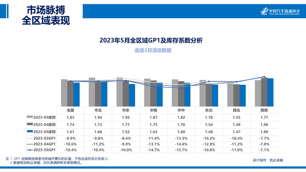 2023年5月,汽车市场趋于稳定,销量表现好于4月,消费者观望情绪消退,市场整体需求小幅增强,全国库存出现小幅下降。分区域来看,华中区域GP1最低,西南区域的库存系数最高。