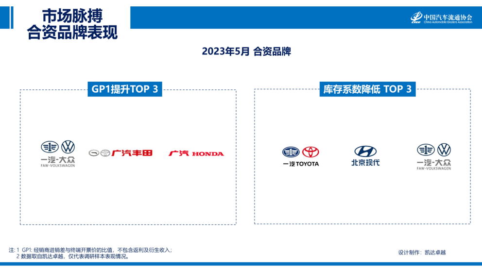 合资品牌中,GP1提升排名前三的品牌是:一汽-大众、广汽丰田、广汽本田;库存系数降低排名前三的品牌是:一汽丰田、北京现代、一汽-大众。