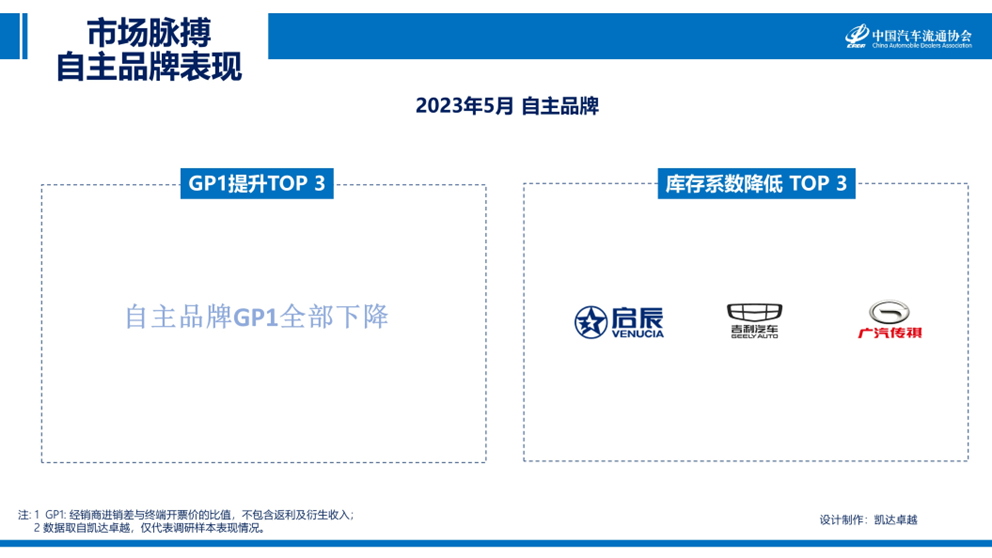 2023年5月,库存系数下降的前三个品牌为:启辰、吉利、广汽传祺;自主品牌GP1全部出现下降。