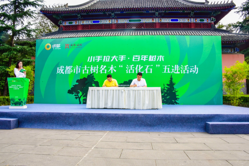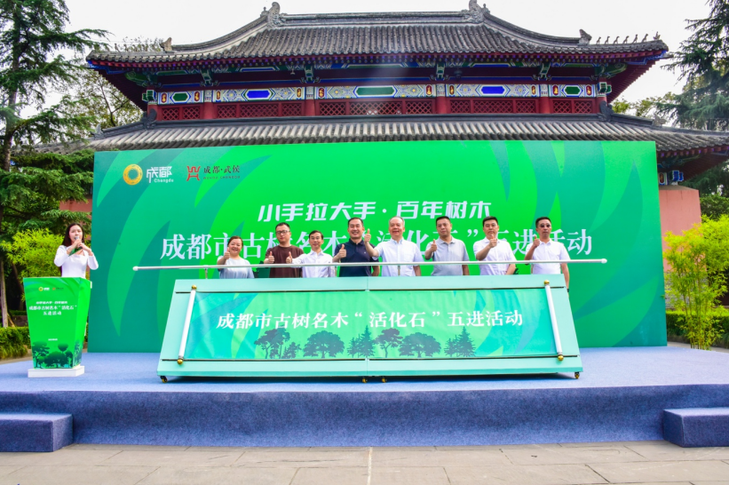 省林草局二级巡视员童伟,市公园城市局副局长古利军,武侯区委常委、区委组织部部长黄永忠等省、市、区领导共同推动活动推杆,宣布成都市古树名木“活化石”五进活动正式启动。