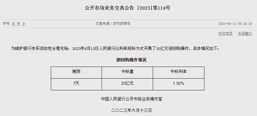红星资本局6月13日消息,央行公告称,为维护银行体系流动性合理充裕,当日以利率招标方式开展20亿元7天期逆回购操作,中标利率1.9%,上次为2.0%,下调10个基点。