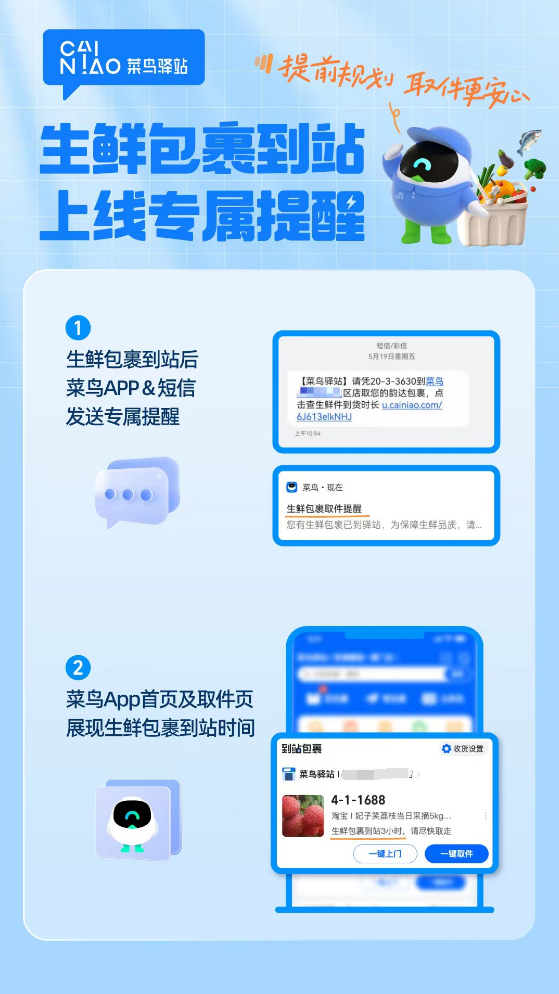 “生鲜取件提醒功能上线几天来,每天都有上百万用户在收到提醒后,在当日及时取走生鲜包裹,让网购生鲜品的体验更省心。”菜鸟驿站驿站取件体验相关负责人介绍,未来,结合不同网购品类的特殊需求,驿站将推出更多定制化的取件服务。