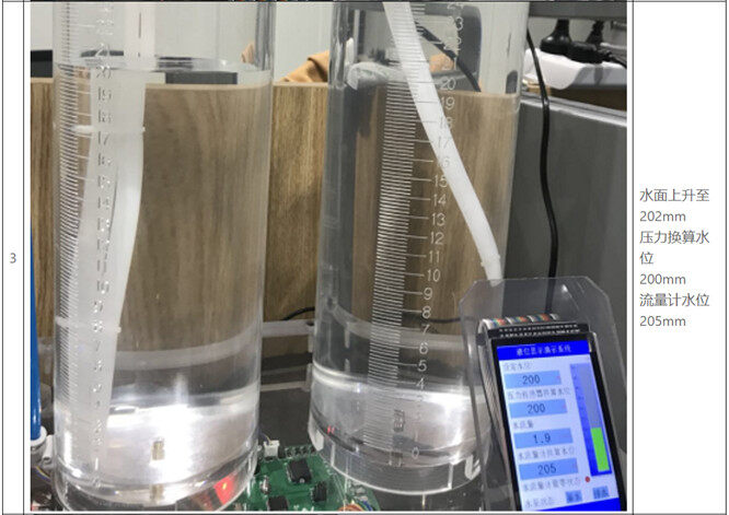 从上表设置水位高度为50mm、200mm、400mm、300mm的4个测试点,通过测试得到下表的NSPGD1实际应用及水流量计对比测试结果: