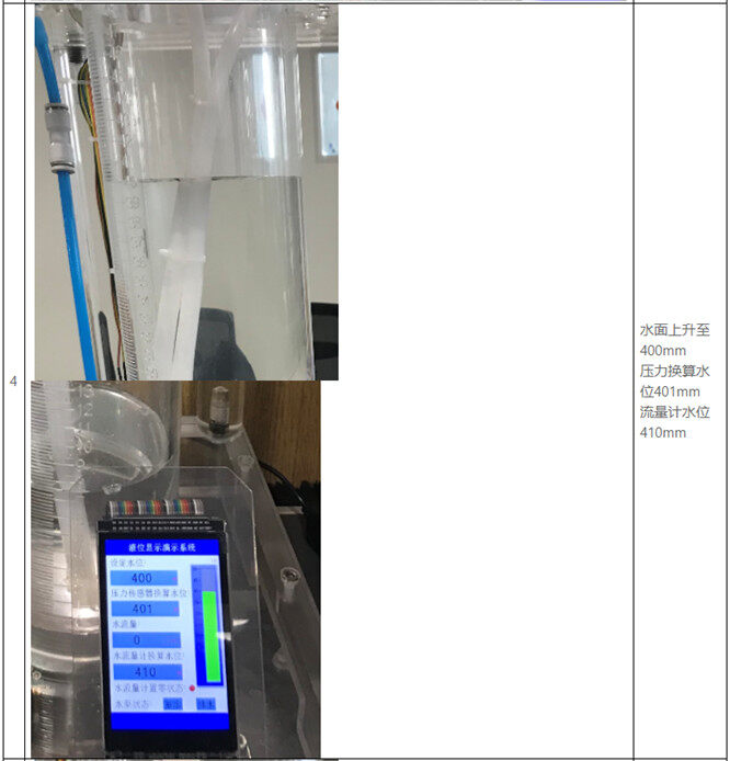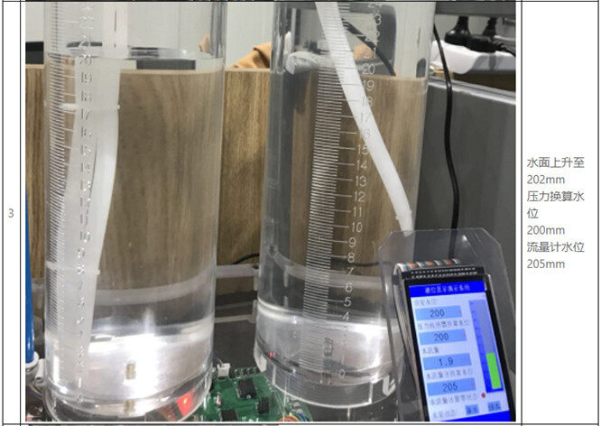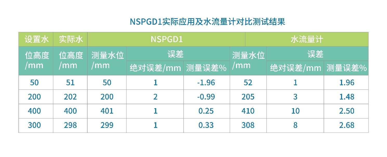 从上表可以看出,NSPGD1的测量结果要比水流量计计算得到的结果精度高,四个测试点中:50mm处测量误差最大为-1.96%(绝对误差1mm),但此时水位较低,误差所占此时水位高度比重大;在全量程中,基于对液体压力实时的测量,NSPGD1的测量结果误差不会累积,数据比较均衡,液位高度误差为1~2mm;流量计在运行时间长后由于脉冲累积误差导致误差变大测量误差最大2.68%,绝对误差达到10mm。
