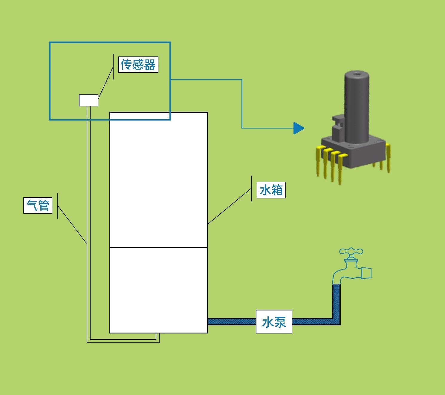 NSPGD1参考应用结构如下图所示,NSPGD1传感器通过气管连接至水箱底部,水箱内水位升高或降低的高度将等比例对应液体压强变化。利用NSPGD1高精度传感器可以实时获取水箱内液体高度,进而根据不同家用电器的控制逻辑,实现自动补给或输送水量。