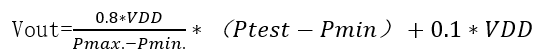以比例输出模式为例(输出电压值为电源电压的百分比),该系列模拟输出型芯片针对0kPa~6kPa量程范围,Pmax为6kPa(输出90%VDD),Pmin为0kPa(输出10%VDD),其典型传递函数为:
