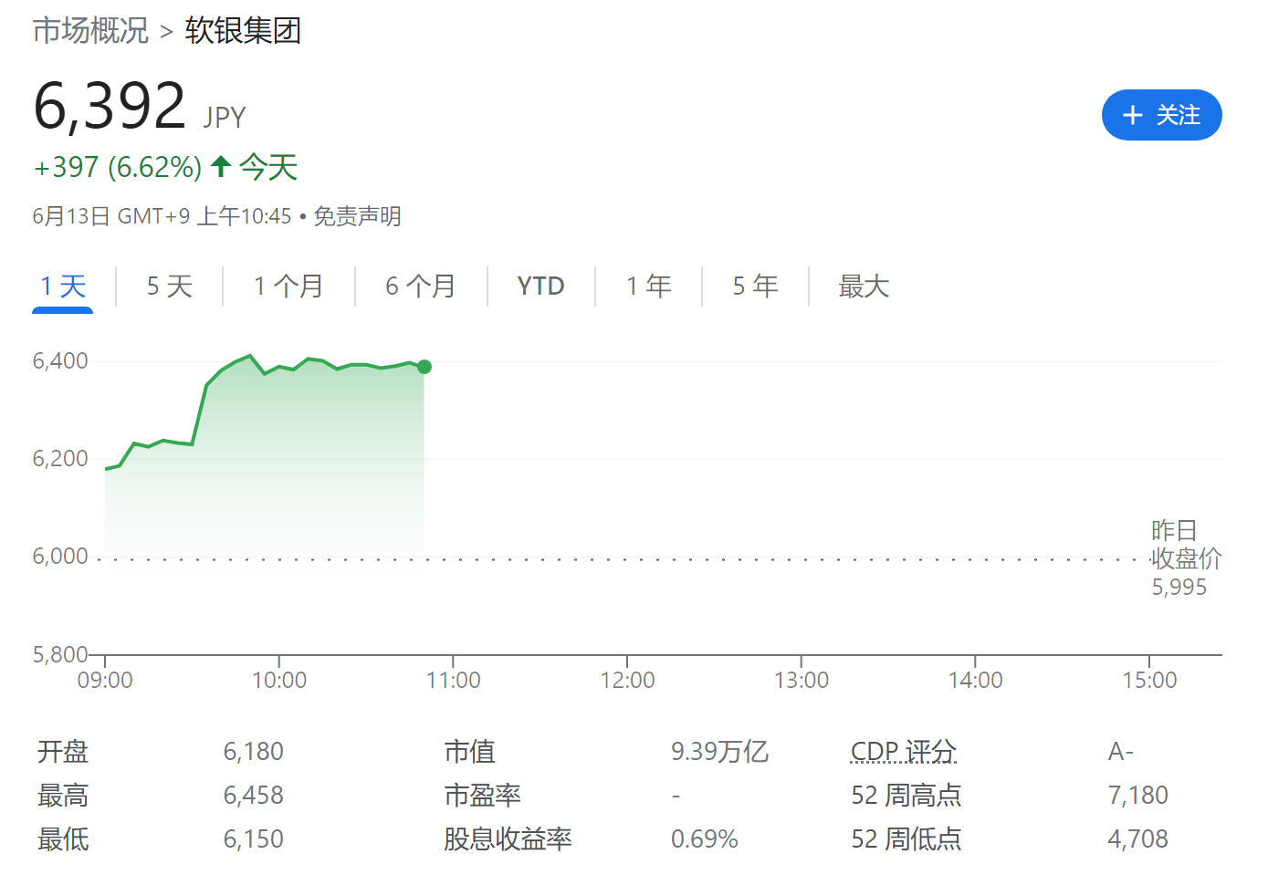 另一方面,受此消息影响,软银股价今天高开高走,截至发稿,软银在东京证交所的股价报于 6392 日元(当前约 328 元人民币),上涨 6.62%。