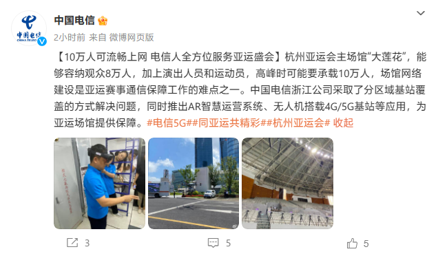 中国电信今日通过官方微博表示,中国电信浙江公司采取了分区域基站覆盖的方式解决问题,同时推出 AR 智慧运营系统、无人机搭载 4G / 5G 基站等应用,为亚运场馆提供保障。