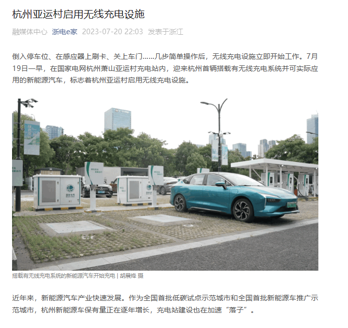 此外,杭州亚运村也于 7 月 19 日启用了国家电网杭州萧山亚运村充电站,包含了 8 个 500kW 大功率充电装置、8 个无线充电停车位及 8 个 60kW 的 V2G(Vehicle to grid,电动汽车入网技术,或称车网互动)充电桩,官方称相当于一个新能源汽车的全能“超级快充站”。